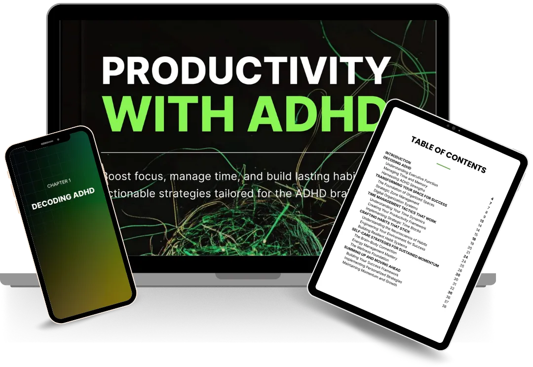 Managing ADHD productivity doesn’t have to feel impossible. With the strategies outlined in the ADHD Productivity Guidebook, we’ve uncovered a system that works with your brain’s natural wiring instead of forcing you into a mold that doesn’t fit. This approach is based on proven research, including time-tested methods for time management, habit formation, and energy optimization designed specifically for individuals with ADHD.
